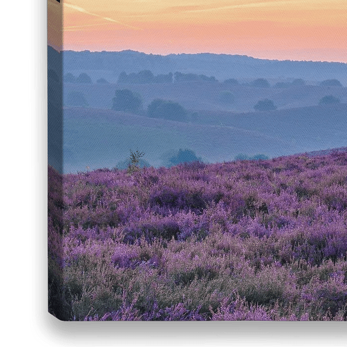 Sonnenaufgang über blühenden Heidekrautfeldern in den Hügeln der Posbank im Naturschutzgebiet Veluwezoom in Gelderland, Niederlande.