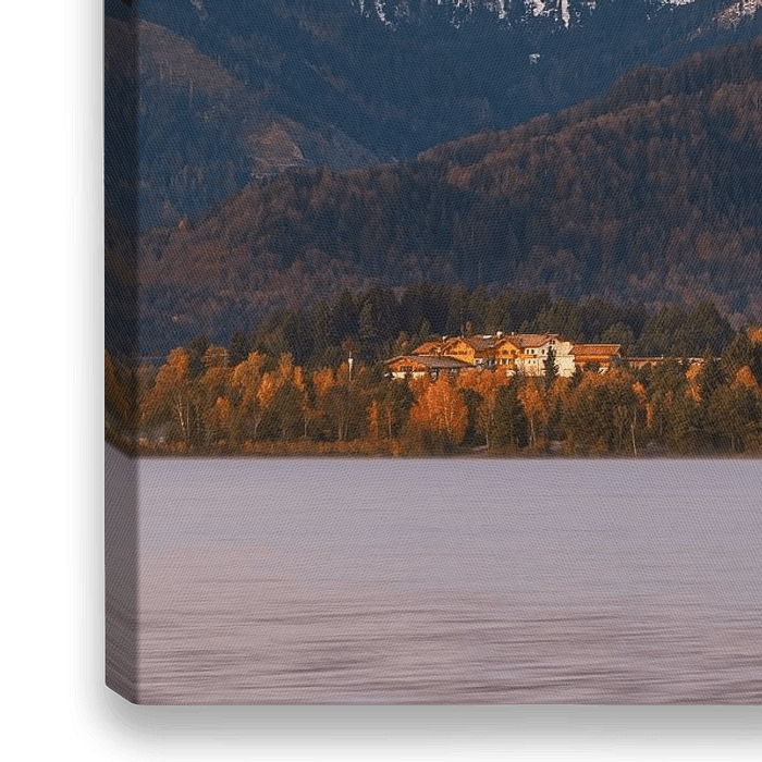 Im stillen Wasser des Sees spiegeln sich die goldenen Farbtöne der aufgehenden Sonne, umgeben von sanften Herbstfarben und eingerahmt von den schneebedeckten Gipfeln der bayerischen Alpen.