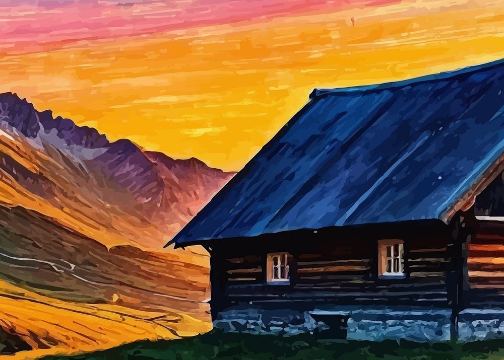 Das Bild zeigt einen atemberaubenden Sonnenaufgang über dem Peitlerkofel am Würzjochpass. Im Vordergrund steht eine rustikale Holzhütte auf einer sanft abfallenden Wiese, die in goldenes Sonnenlicht getaucht ist. Der Himmel ist in leuchtenden Orange-, Rosa- und Blautönen gehalten, während die dramatischen Berggipfel im Hintergrund die ruhige und doch majestätische Atmosphäre dieser Alpenlandschaft unterstreichen.