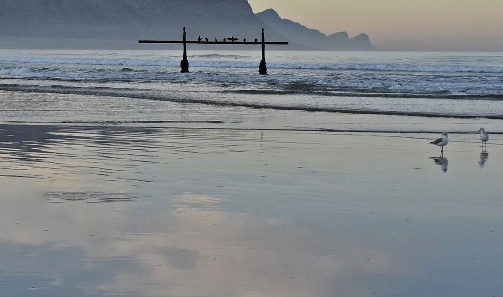 Landschaft mit einem Sonnenaufgang über der False Bay und den Overbergen in Strand
