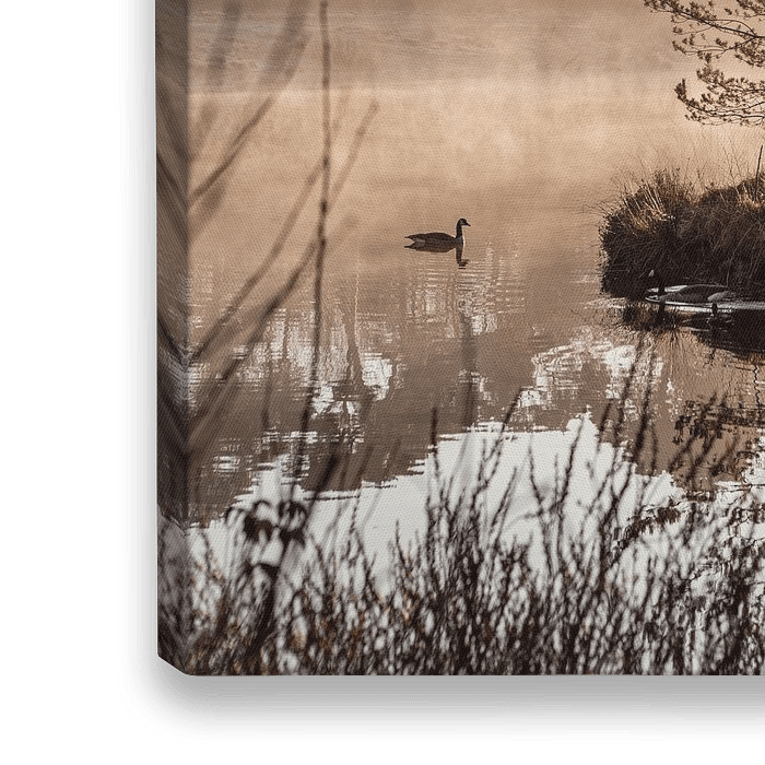 Bestelle dieses Landschafts-Wandbild Sonnenaufgang über einem See mit Nebel und Enten von Evelien Oerlemans als Reproduktion auf Leinwand, Alu-Dibond, als Poster, Fototapete oder Acrylglasbild.