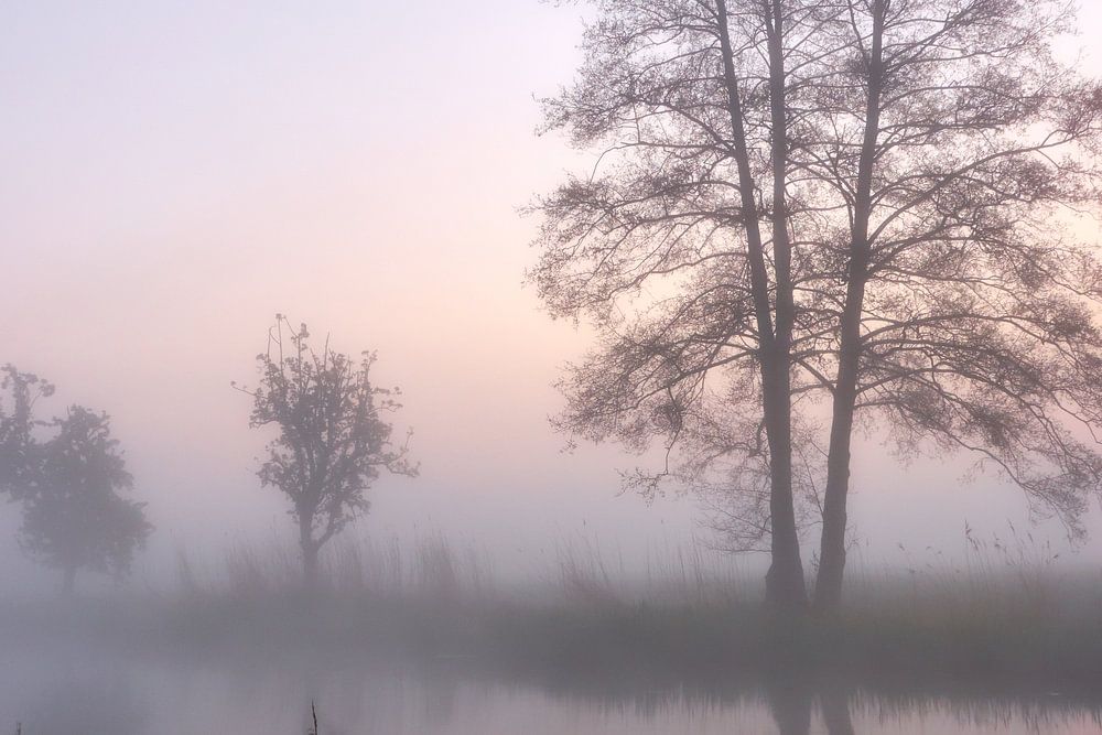 Ein ruhiger Morgen an der niederländischen Waterline. Niedrige Temperatur, wenig Wind und hohe Luftfeuchtigkeit, so dass es bei Sonnenaufgang neblig ist. Die Nieuwe Hollandse Waterlinie (NHW) ist eine wichtige Verteidigungslinie in der niederländischen Geschichte. Neben dem Wasser stehen alte, skurrile Obstbäume und der Raps steht in voller Blüte. Die heitere Ruhe ist ein Segen.