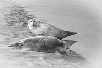 Über „Sonnenbadende Robben am Strand“ von Meindert Marinus