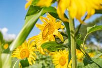 Fröhliche Sonnenblumen, fotografiert aus der Nähe an einem schönen Sommertag.