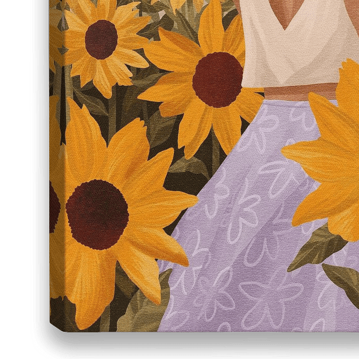 Romantische Illustration einer Frau in einem fliederfarbenen Rock inmitten von Sonnenuntergangssonnenblumen. Ein Sommerabend voller Duft und Farbe.