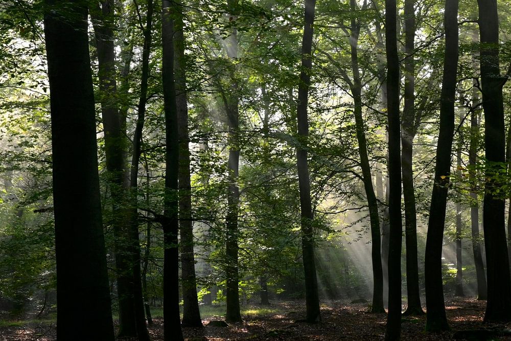 Hier im Wald der Gieten-Borger-Forstwirtschaft in Drenthe bricht die Sonne buchstäblich durch die Bäume.