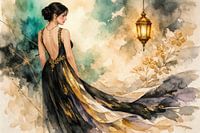 Dieses Gemälde zeigt eine elegante Frau, die von hinten dargestellt ist und in einer verträumten, aquarellartigen Umgebung steht.