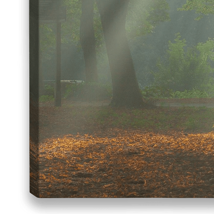 Ein schöner Morgen im Amsterdamse Bos mit Nebel, wo die Sonne durchkam.