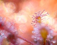 Nahaufnahme des schönen Sonnentaus, das Sonnenlicht auf den Tröpfchen erzeugt ein schönes Bokeh.
