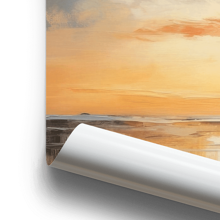Sunset Painting | Vivid Sunset - Das Kunstwerk zeigt einen lebendigen Eindruck eines weiten Sonnenuntergangs, dessen orangefarbene und gelbe Töne nahtlos in die kühlen Blau- und Grautöne des Himmels und des spiegelnden Wassers übergehen. Die ausdrucksstarken Pinselstriche zeigen eine dynamische und doch beruhigende Atmosphäre.