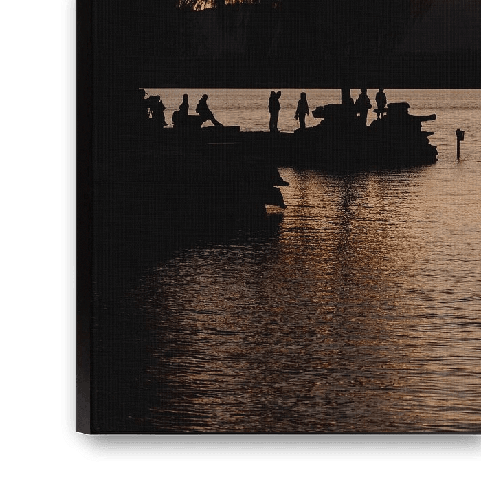 Dies ist eine Silhouettenaufnahme bei Sonnenuntergang. Wir sehen Menschen am Ufer, die auf einer steinernen Plattform sitzen oder gehen, während sich die anmutigen Weiden sanft im Wind biegen. Der Himmel färbt sich in warmes Orange und zartes Rosa, mit dunklen Bergkonturen im Hintergrund. Das Wasser fängt das letzte Licht ein und bildet eine ruhige, spiegelnde Struktur.