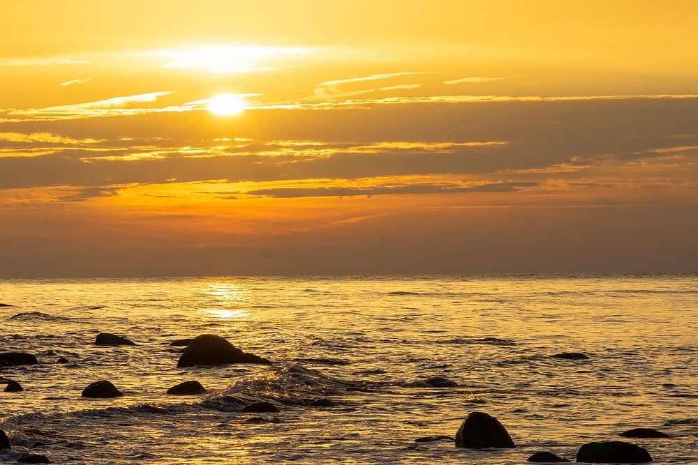 Sonnenuntergang am Strand mit großen Felsen im Wasser an der Ostsee auf Rügen