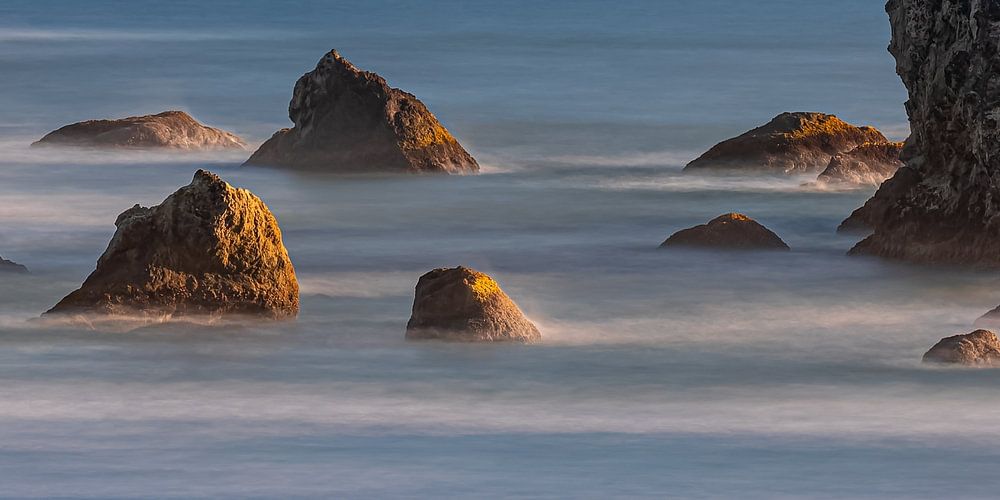 Ein 2:1-Foto von Bandon Beach, wo mehrere Meeresstapel bei Sonnenuntergang ein wunderschönes Motiv bilden. Am Bandon Beach bestehen diese Meeresstapel aus Sandstein, Grünstein, Hornstein und sogar Blausteinblöcken. Diese Gesteine gehören zur Otter Point Formation aus dem Jura, einem Teil der Franciscan Assembly, die während der Kreidezeit an der Westküste Nordamerikas entstanden ist.