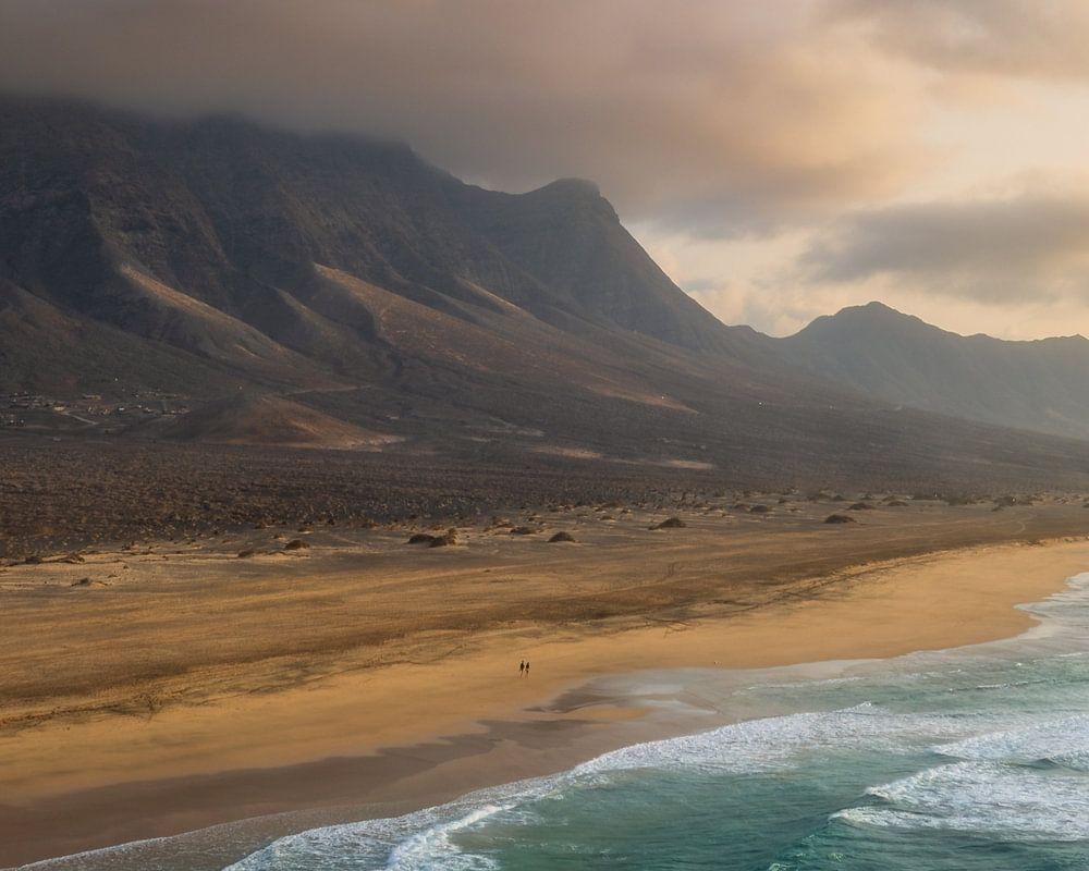 Die Wellen plätschern sanft gegen einen einsamen Sandstrand, während sich im Hintergrund schroffe Berge erheben, die teilweise in Wolken gehüllt sind. Sanftes Sonnenlicht wirft einen warmen Schein auf die Landschaft und schafft eine friedliche und malerische Küstenlandschaft.
