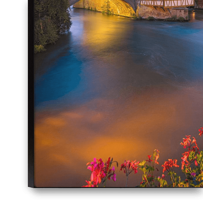 Bestelle das Foto Sonnenuntergang am alten Rathaus in Bamberg, Bayern, Deutschland von Henk Meijer Photography als Reproduktion auf Leinwand, Alu-Dibond, als Poster, Fototapete oder Acrylglasbild.
