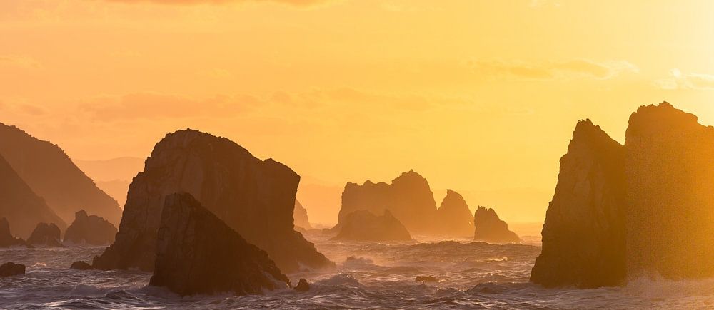 Sonnenuntergang an der Nordküste Spaniens in der Region Asturien! Die Wellen schlagen gegen die Klippen und Felsen und die Sonne färbt alles golden während der goldenen Stunde!
