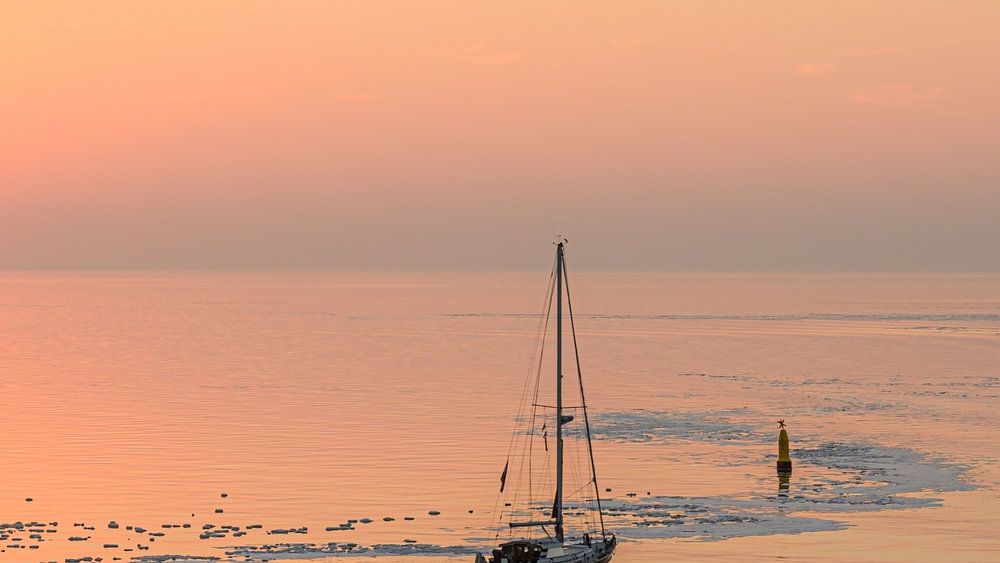 Sonnenuntergang auf dem Wattenmeer. Das Foto wurde auf der Fähre zwischen Vlieland und Harlingen, Niederlande, aufgenommen. Das vorbeifahrende Segelboot gibt eine schöne romantische Atmosphäre. Ein schönes Foto, das über dem Sofa im Wohnzimmer und auch im Schlafzimmer gut aussehen wird. Das Foto wurde auf der Rückfahrt nach einem herrlich entspannenden Herbsturlaub im schönen Vlieland (Friesland, Niederlande) aufgenommen.