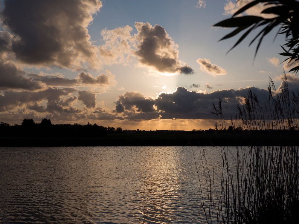 Vom Deck aus sehen Sie den schönen Sonnenuntergang und hören den Wind durch das Schilf seufzen. Foto aufgenommen an einem schönen Abend im Mai in den Niederlanden.
