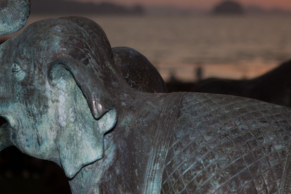 Sonnenuntergang hinter einem Elefantenspringbrunnen am Strand von Krabi (Thailand).