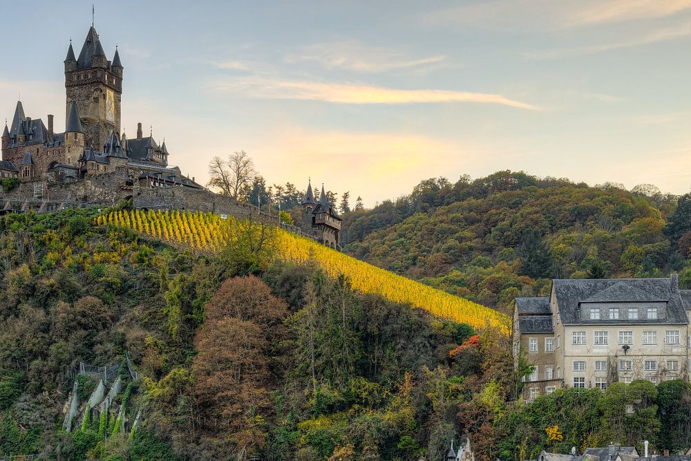 Blick über die Mosel zur Reichsburg Cochem die hoch über den Häusern der Stadt thront.