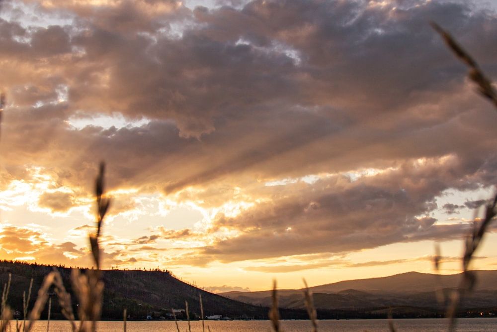 Die Gegend um den Rocky Mountain National Park in Colorado ist fast so spektakulär wie der Park selbst. Hier gibt es überall Seen, ein perfekter Ort, um den spektakulären Sonnenuntergang zu genießen. Die Grasbüschel im Vordergrund verleihen dem Foto eine schöne Wirkung, gerade um die Sonnenstrahlen herum, die gegen die Wolken leuchten. Was für ein magischer Abend.