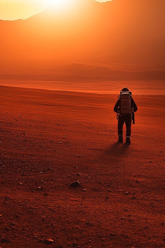 Ein einsamer Wanderer durchquert eine weite, rotsandige Landschaft, während die Sonne mit strahlenden Farben untergeht. Die sanften Wellen der Berge im Hintergrund verleihen dem Szenario eine mystische Tiefe. Dieses Bild strahlt Ruhe und Sehnsucht aus, perfekt geeignet für ein Wohnzimmer, wo es zum Träumen und Entspannen einlädt.