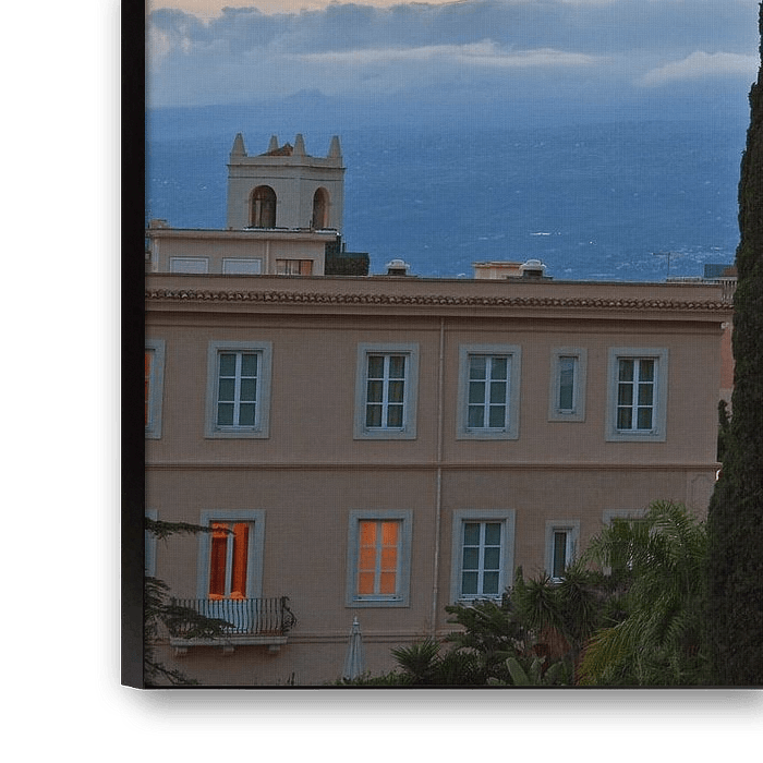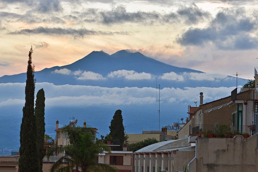 Das Naturmotiv zeigt ein paradiesisches Panorama und zauberhaftes Naturspektakel über der bekannten sizilianischen, touristischen Hochburg Taormina mit Blick auf den aktiven Vulkan Ätna.