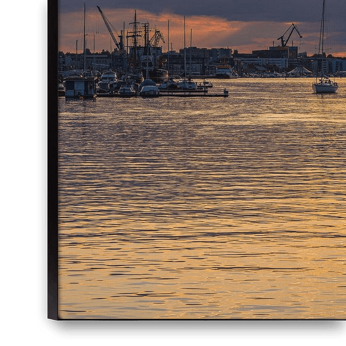 Bestelle das Foto Sonnenuntergang mit Segelbooten im Stadhafen von Rostock von Rico Ködder als Reproduktion auf Leinwand, Alu-Dibond, als Poster, Fototapete oder Acrylglasbild.