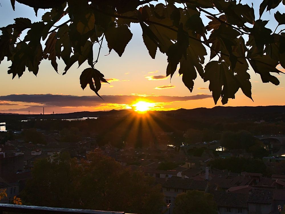 Sonnenuntergang über der Stadt Avignon am Ufer der Rhone in der Provence im Süden von Frankreich im Herbst vom Rocher des Doms aus gesehen mit einem Zaun und der Silhouette eines Baumes im Vordergrund.