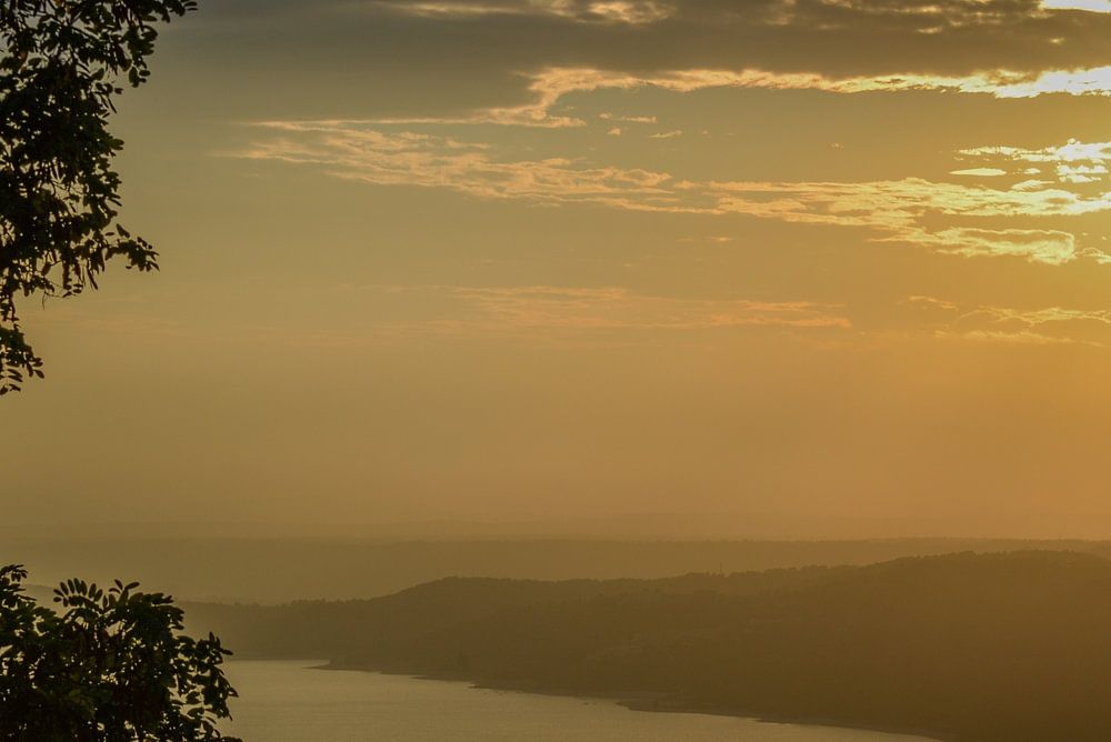 Der wunderschön gelegene St. Croix-See in den französischen Alpen bei Aiguires glitzert an einem Sommerabend, von der untergehenden Sonne gelb-orange gefärbt.