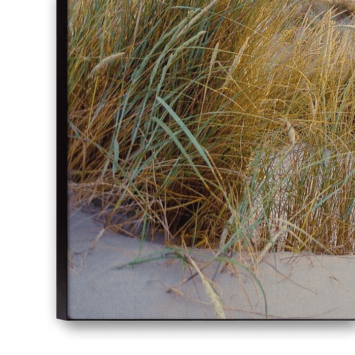 Die Sonne versinkt am Strand von Ameland im Sommer langsam unter. Die letzten Strahlen der Sonne scheint nur durch halmgras auf der Düne.