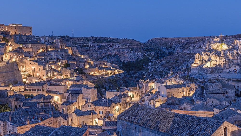 Ein 16x9-Foto von einem Abend in Matera, Italien, mit wolkenlosem Himmel.