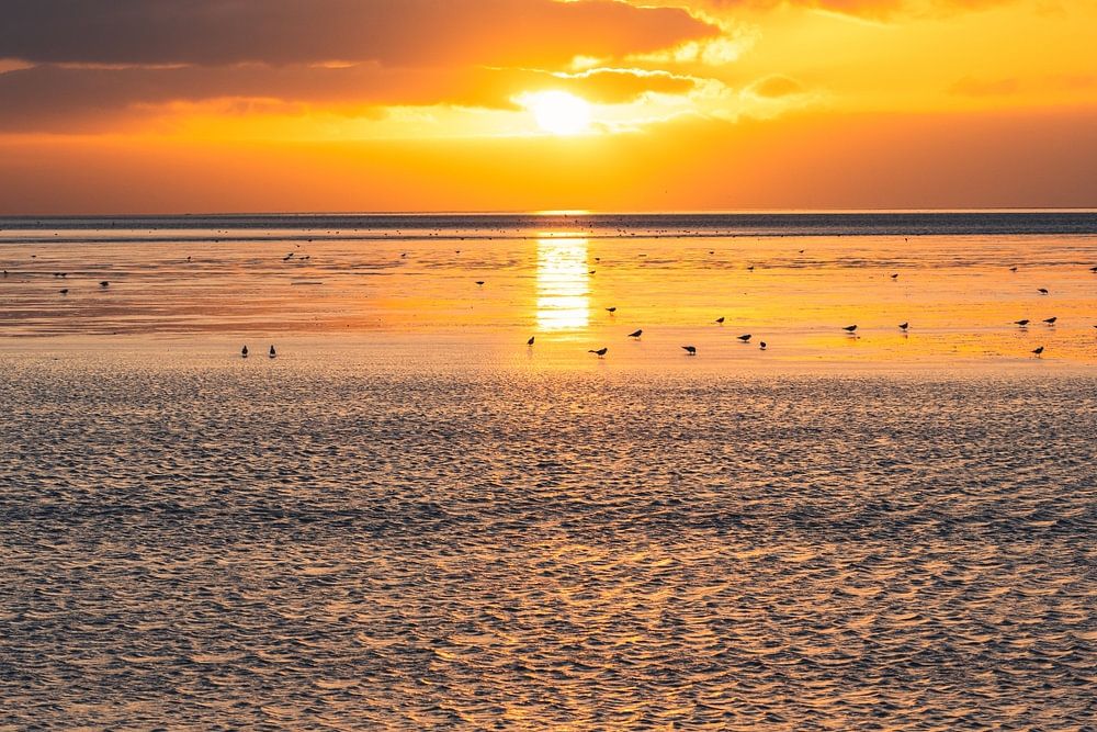 Untergehende Sonne am Strand der Nordsee bei Ebbe, Spiegelung im Wasser, im Vordergrund Spuren im Watt, Norden, Norddeich, Ostfriesland