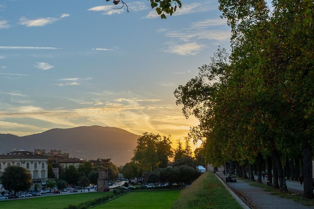 Sonnenuntergang, fotografiert von der Stadtmauer der historischen Stadt Lucca in der Toskana Italien