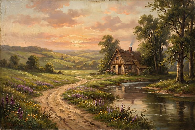 Lassen Sie sich mit Sunset over the Silent Countryside in einen Moment der Ruhe und Einfachheit entführen. Dieses Kunstwerk zeigt eine idyllische Landschaft voller warmer, natürlicher Farben: Sanfte grüne Hügel sind in das weiche Licht der untergehenden Sonne getaucht, während ein gewundener Pfad zwischen Wildblumen zu einem kleinen…