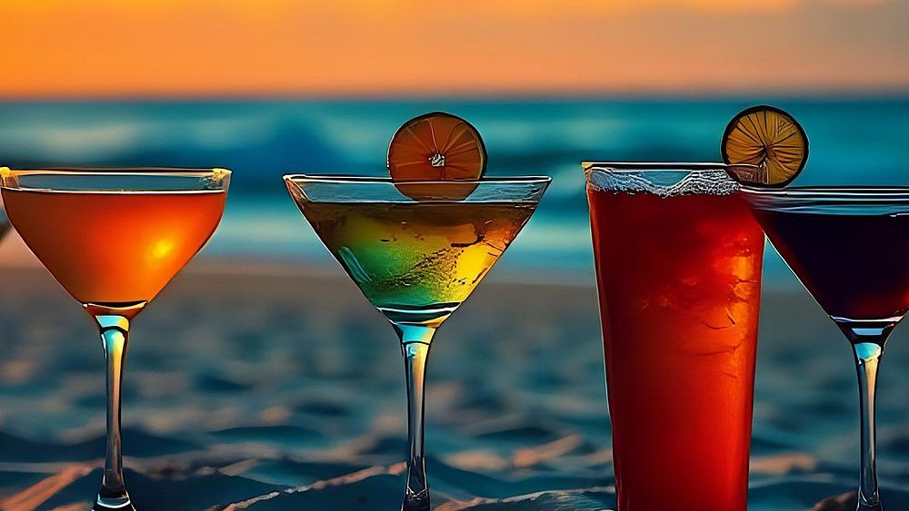 Diese Komposition strahlt eine fröhliche und unbeschwerte Stimmung aus, die den Betrachter auf eine Reise in die Welt der tropischen Genüsse einlädt. Die Kombination aus den bunten Cocktails, dem goldenen Sand und dem malerischen Sonnenuntergang schafft ein harmonisches Bild des Glücks und der Freiheit – eine perfekte Einladung, den Alltag hinter sich zu lassen und den Moment zu genießen. In dieser Szenerie verschmelzen Genuss und Natur zu einem unvergesslichen Erlebnis.