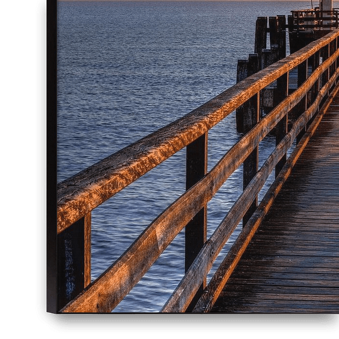 Bestelle das Foto Sonniger Morgen an der alten Seebrücke von Scharbeutz. von Voss Fine Art Fotografie als Reproduktion auf Leinwand, Alu-Dibond, als Poster, Fototapete oder Acrylglasbild.
