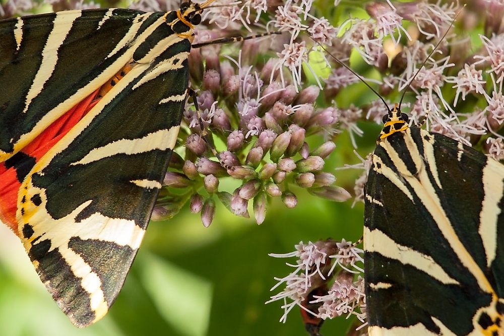 Twee vlinders genaamd Spaanse vlag. vlinders die overdag actief zijn maar toch tot de nachtvlinders behoren. Als ze zich bedreigt voelen laten ze ineens de felrode kleur van hun achtervleugels zien. De aanvaller schrikt en weg is de vlinder, althans dat is de bedoeling.