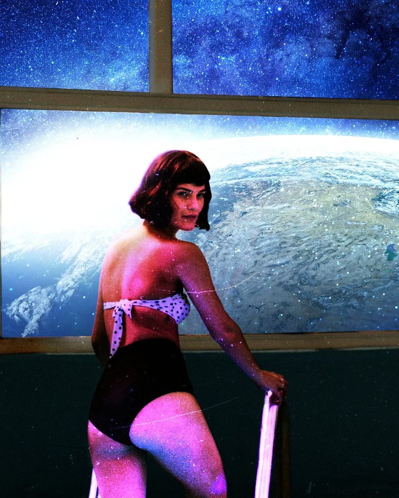 Eine Fotomontage aus einer Frau die aus einem Pool steigt und der Erde im Hintergrund.