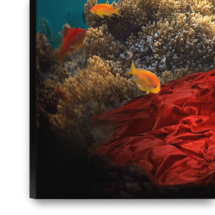 Unterwasser-Fantasy-Bild, in dem eine Flamengo-Tänzerin Hand in Hand mit zwei spanischen Tänzern vor einem Hintergrund eines Riffes geht.