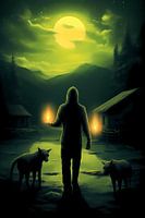 Dieses fesselnde Kunstwerk zeigt einen Mann in einem Kapuzenpulli, der mit zwei Hunden spazieren geht, eingehüllt in das warme Licht von Feuer und Laternen vor einer ruhigen Bergkulisse. Die in einem markanten Vektorstil gestaltete Szene fängt den Moment von hinten ein und betont die Einsamkeit der Figur, während sie über den nassen…