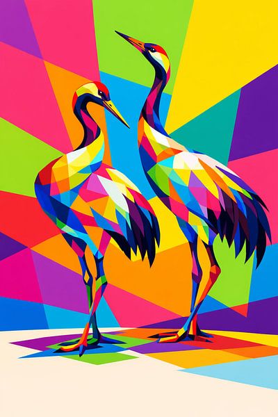 "Eine atemberaubende geometrische Illustration von zwei eleganten Kranichen in leuchtenden Polygonfarben. Die länglichen Formen und der dynamische Farphintergrund schaffen eine harmonische und dennoch moderne Komposition, die von zeitgenössischer abstrakter Wildtierkunst inspiriert ist. Ideal für Käufer, die farbenfrohe Vogelkunst…