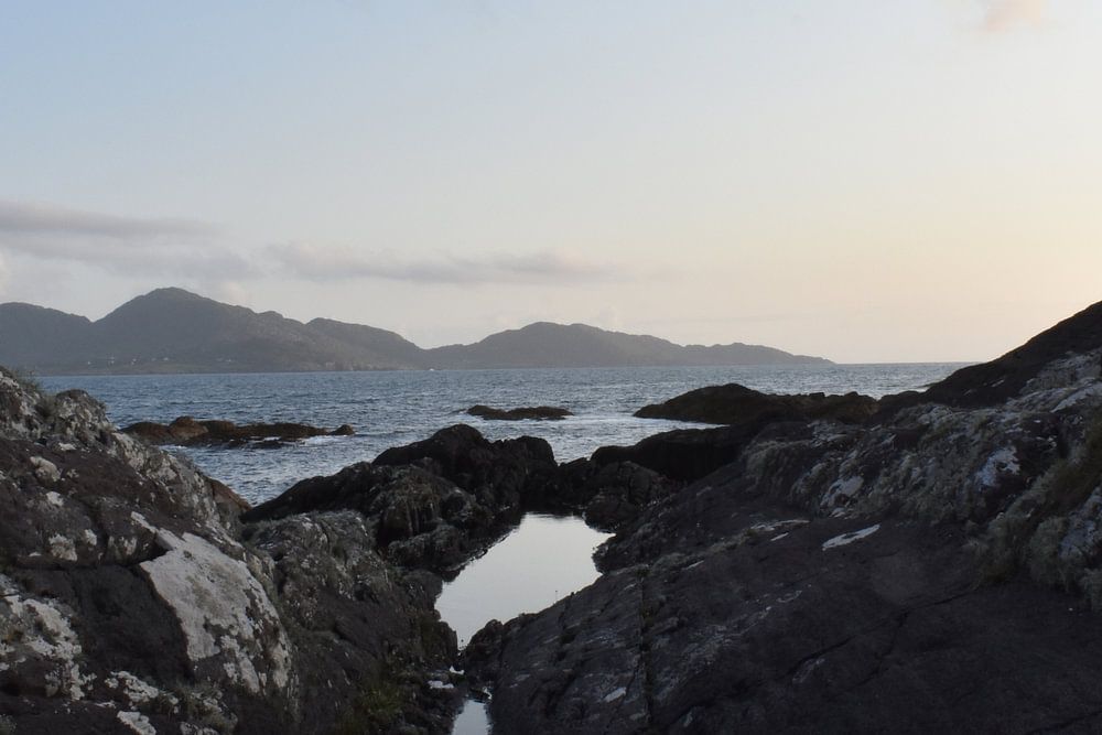 Eine Landschaft. Die Luft spiegelt sich in einem Wasserbecken. Sie blicken auf das Meer mit Bergen im Hintergrund. Sonnenuntergang.