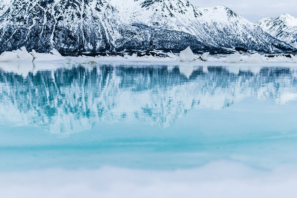 Die große Gebirgskette der Vesterålen, Norwegen, spiegelt sich im eisig hellblauen Wasser.