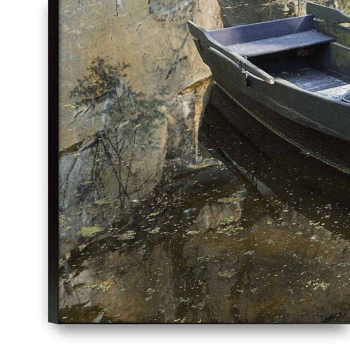 Bezauberndes Ambiente an einem entlegenen Ort. Am Ufer eines kleinen Steinbruchs spiegelt sich eine steile Felswand in ruhigen Wasser. An einem schlanken Baumstamm ist ein Holzboot befestigt. Die Natur schläft noch, aber das Frühlingserwachen steht bevor.