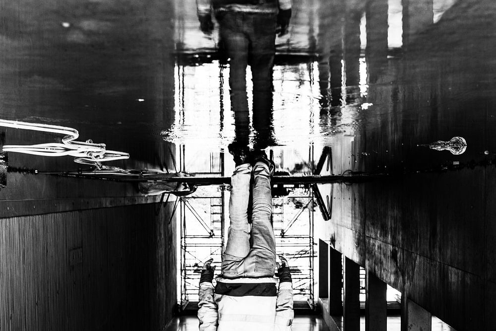 Eine gedrehte Spiegelung im Wasser eines Arbeiters auf einer Baustelle, auf der ein Tunnel gebaut wird.