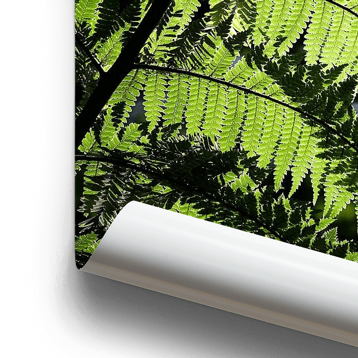 Mehrere Blätter von Farnen blockieren eine helle Sonne, die versucht, den Boden zu erreichen. Die sich überlappenden Blätter erzeugen ein besonderes Spiel von Licht und Dunkelheit in Formen und Linien.