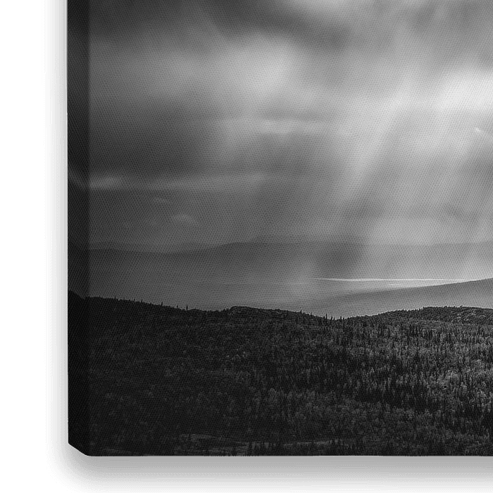 Eine schwarz-weiße Landschaft. Wolken, Sonnenlicht, Seen und Berge. Alles ist vorhanden. Ein dramatisches Bild des Zusammenspiels von Hell und Dunkel. Sarek, Nationalpark in Schweden.