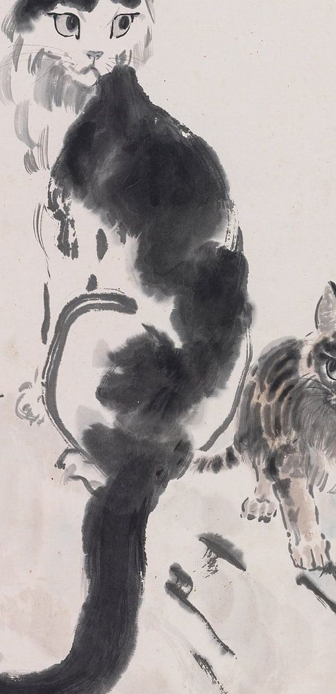 Diese Katzen haben Spaß und spielen miteinander in dieser schwarz-weiß gemalten Szene.