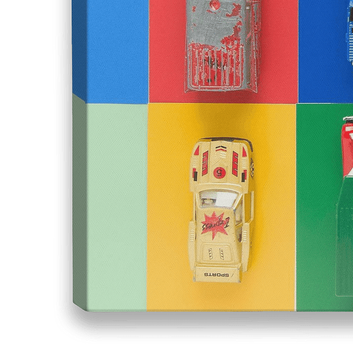Bestelle dieses Popart-Wandbild Spielzeug-Autos auf mehrfarbigen Hintergrund von Wijnand Loven als Reproduktion auf Leinwand, Alu-Dibond, als Poster, Fototapete oder Acrylglasbild.